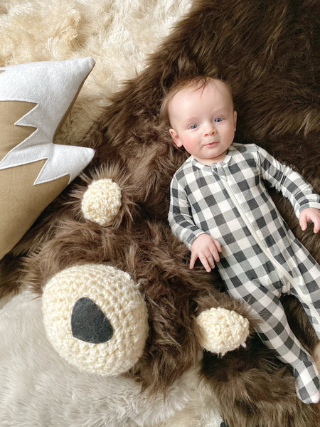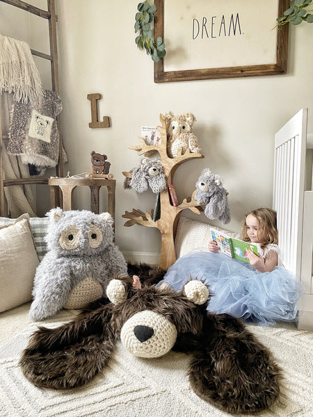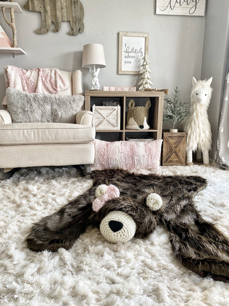 This Bear Nursery Rug is made with faux fur, polyester stuffing, yarn, and felt.