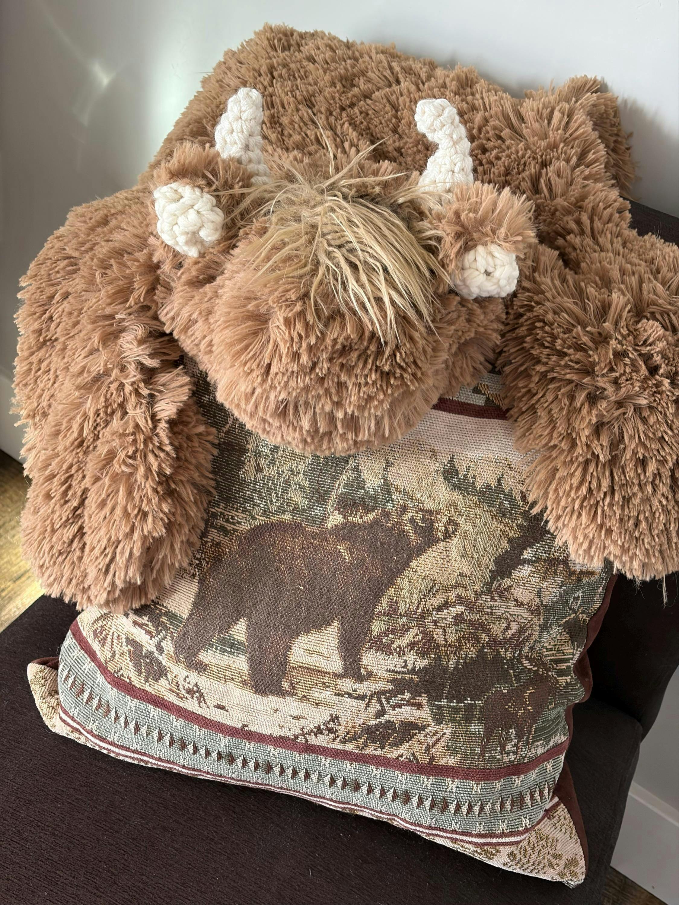 This Highland Cow Blanket is made with faux fur, polyester stuffing, and yarn.
