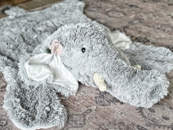 ClaraLoo Elephant Rug: This plush faux fur rug is lined with a soft flannel fabric. This charming elephant rug has crochet tusks and a crochet snout.