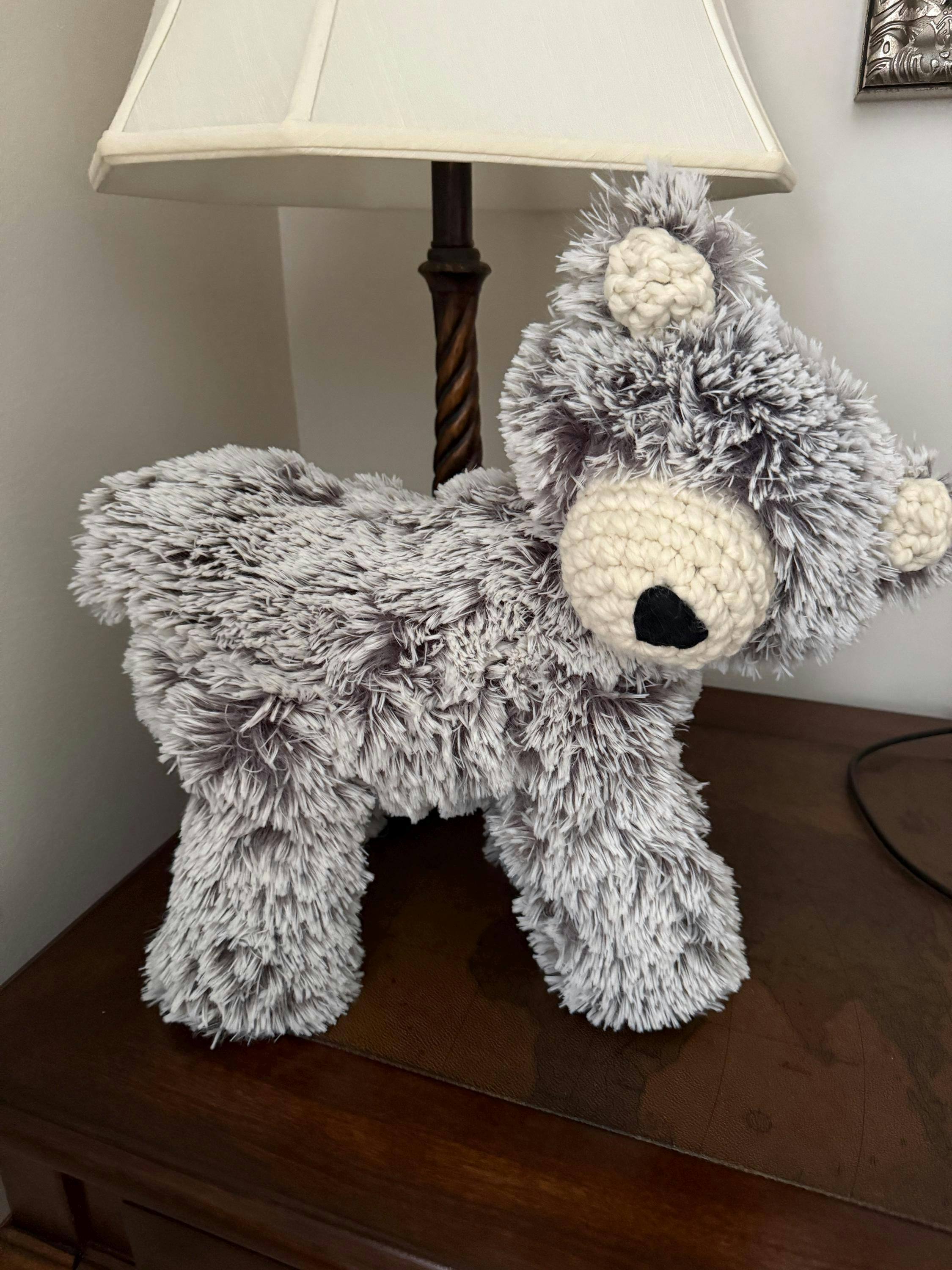This Stuffed Teddy Bear is made with faux fur, polyester stuffing, yarn, and felt.