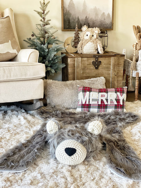ClaraLoo Animal Rugs are made with faux fur, polyester stuffing, flannel fabric, yarn, and felt (for some of the animals).