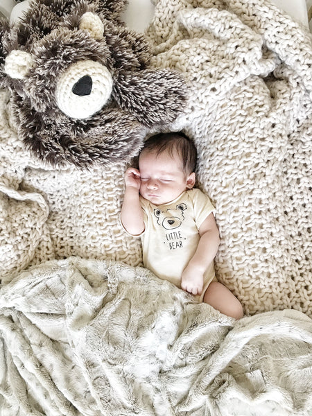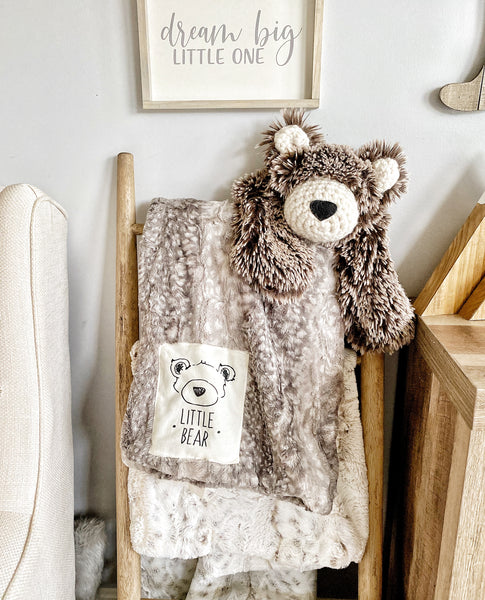ClaraLoo Animal Loveys are made with faux fur, polyester stuffing, flannel fabric (for some of the animals), yarn, and felt (for some of the animals).