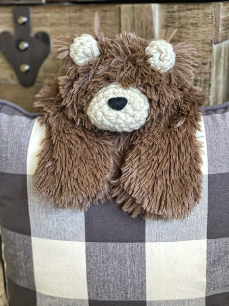 ClaraLoo Cappuccino Minky Bear Lovey. This is a double-sided faux fur bear lovey with a stuffed head. This charming plush bear features crochet ears and muzzle.